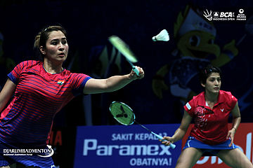 Ashwini Ponnappa/Jwala Gutta (India) mengembalikan shuttlecock