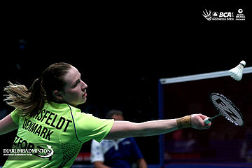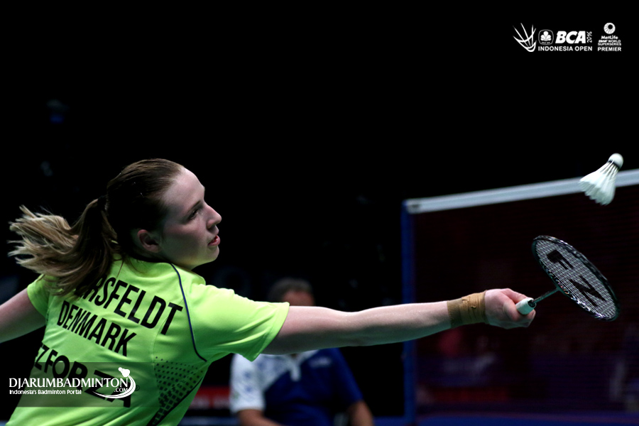 Line Kjaersfeldt (Denmark) mengembalikan shuttlecock