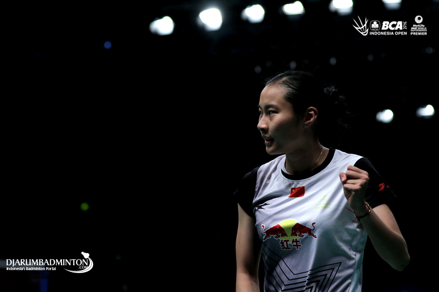 Ekspresi Wang Yihan (Tiongkok) saat berhasil mencuri poin
