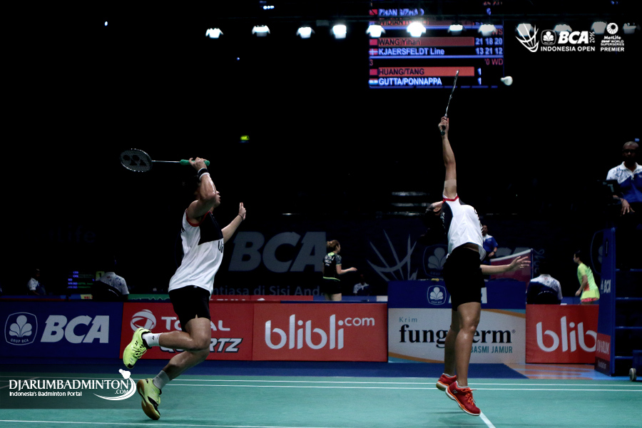Riky Widianto/Richi Puspita Dili (Indonesia) menghadang serangan