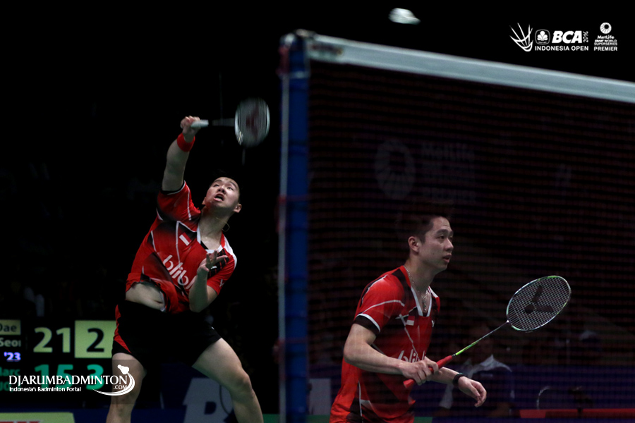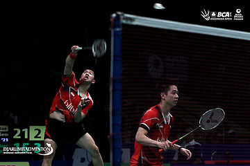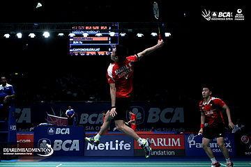Kevin Sanjaya/Markus Fernaldi Gideon (Indonesia) melepaskan serangan