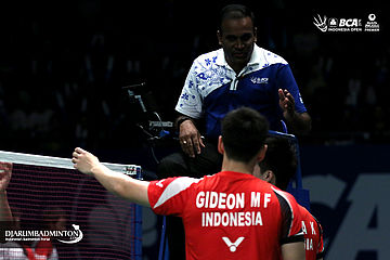 Kevin Sanjaya/Markus Fernaldi Gideon (Indonesia) melakukan protes kepada Umpire