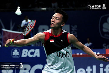 Ihsan Maulana Mustofa (Indonesia) mengembalikan shuttlecock