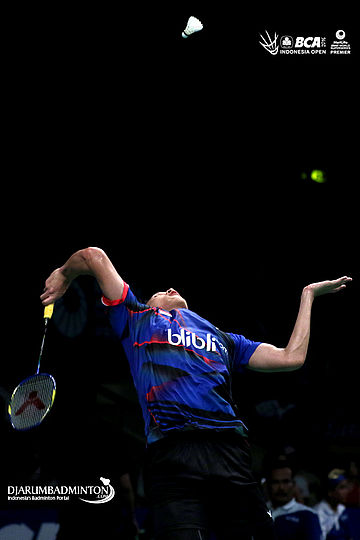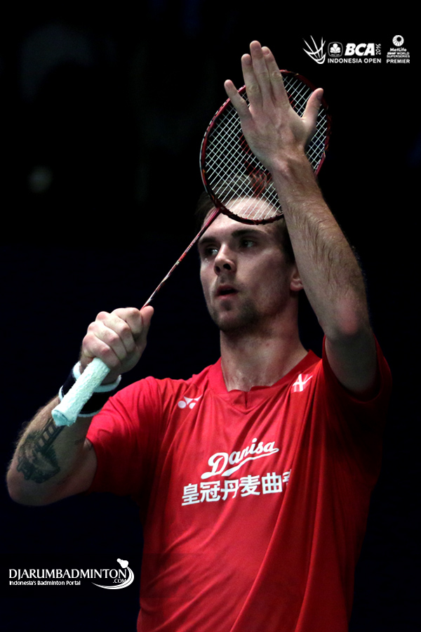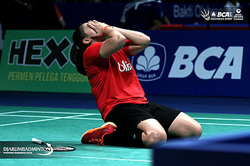 Jan O Jorgensen (Denmark) memberikan apresiasi kepada seluruh pengunjung yang memadati Istora Senayan, Jakarta