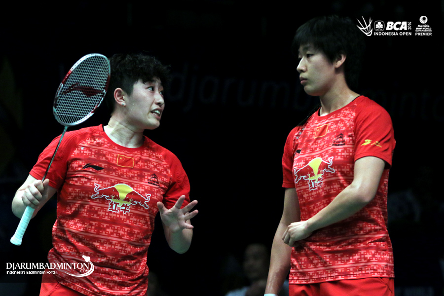 Yu Yang/Tang Yuanting (Tiongkok) saling berkomunikasi di lapangan