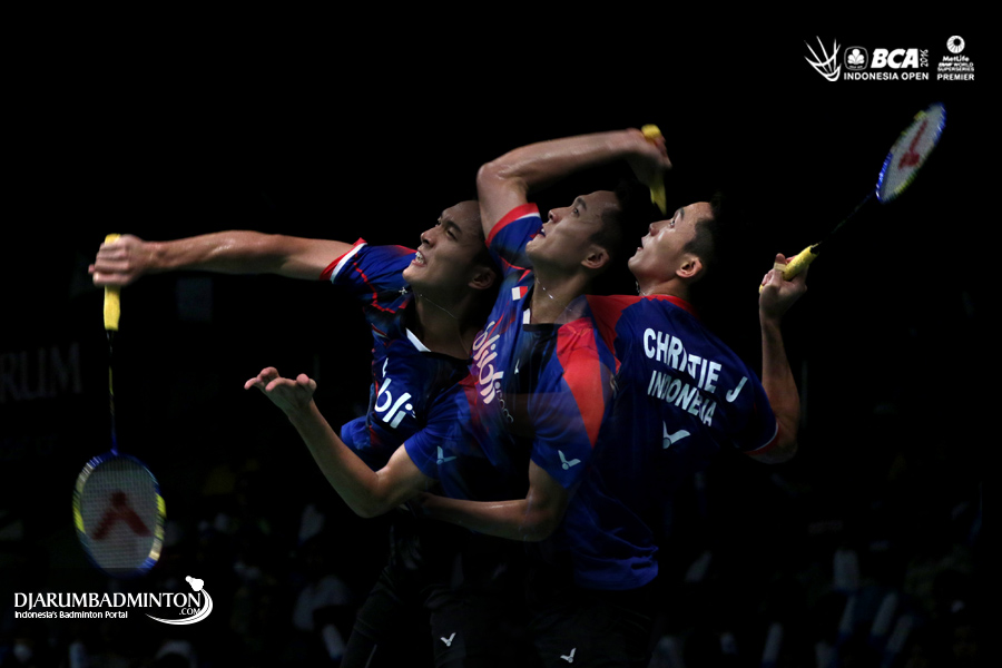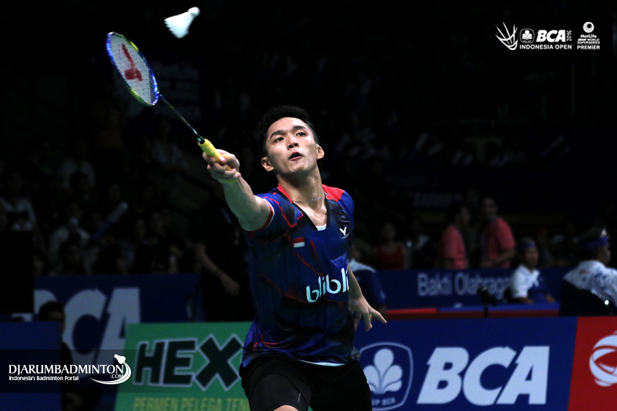 Jonatan Christie (Indonesia) mengembalikan shuttlecock