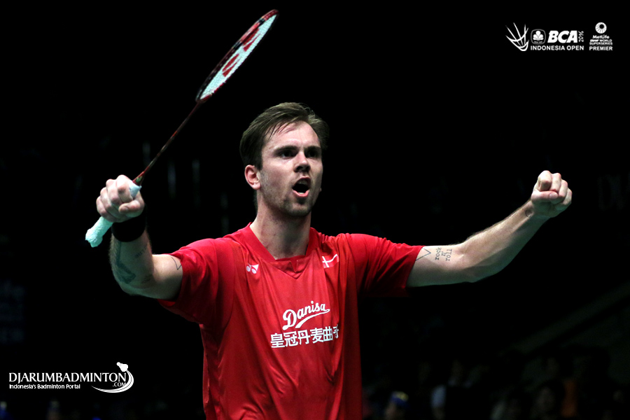 Jan O Jorgensen (Denmark) melakukan protes kepada Umpire