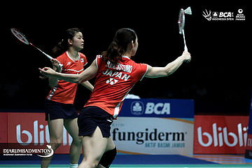 Ayaka Takahashi/Misak Matsutomo (Jepang) mengembalikan shuttlecock