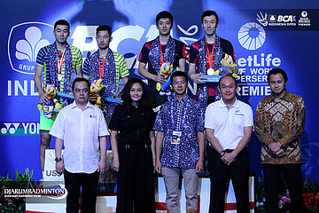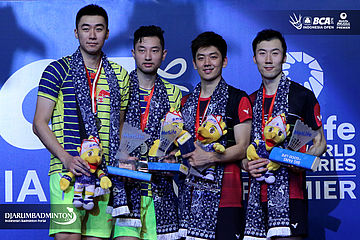 Chai Biao/Hong Wei (Tiongkok) dan Lee Yong Dae/Yoo Yeon Seong (Korea) di podium