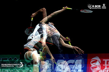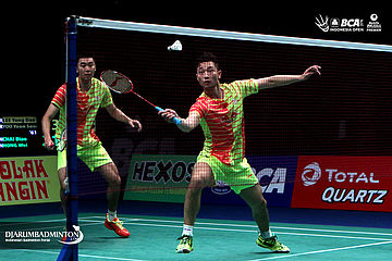 Lee Yong Dae/Yoo Yeon Seong (Korea) menghadang serangan
