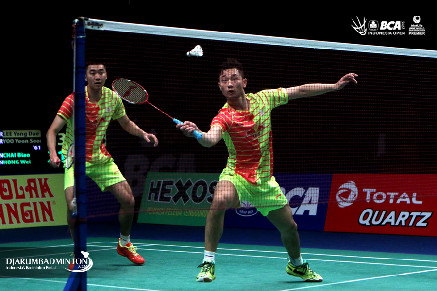 Chai Biao/Hong Wei (Tiongkok) dan Lee Yong Dae/Yoo Yeon Seong (Korea) di podim