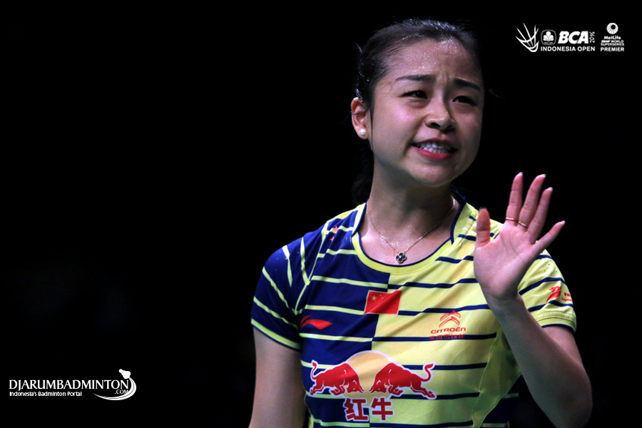 Xu Chen/Ma Jin (Tiongkok) saling berkomunikasi di lapangan