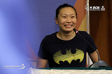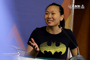 Ekspresi Zhang Beiwen (USA) saat menjawab pertanyaan di Press Conference BCA Indonesia Open Superseries Premier 2017
