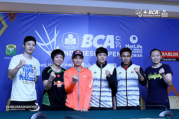 Shi Yuqi, Chen Qingchen, Tai Tzu Ying, Sapsiree Taerattanachai, Dechapol Puavaranukroh dan Zhang Beiwen berfoto bersama usai Press Conference BCA Indonesia Open Superseries Premier 2017