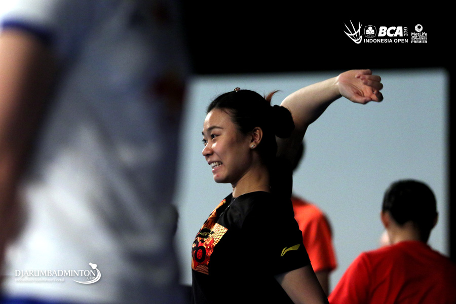 Tang Jinhua (Tiongkok) melakukan peregangan sebelum memulai latihan