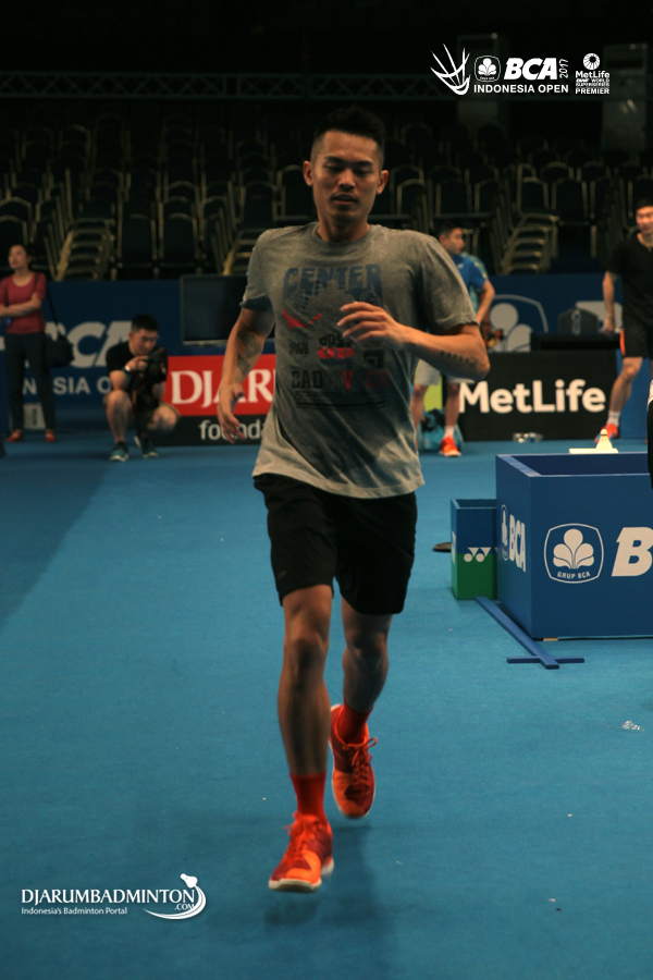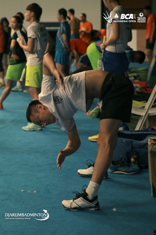 Lin Dan (Tiongkok) melakukan pemanasan sebelum berlatih
