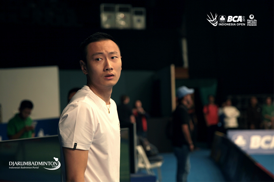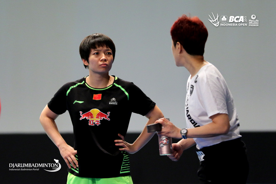 Chen Qingchen (Tiongkok) mendapatkan arahan sebelum memulai latihan