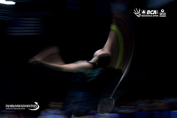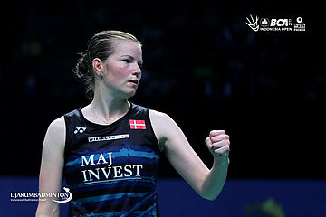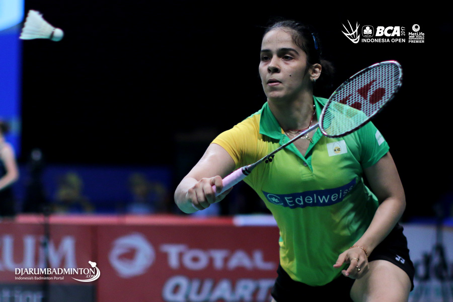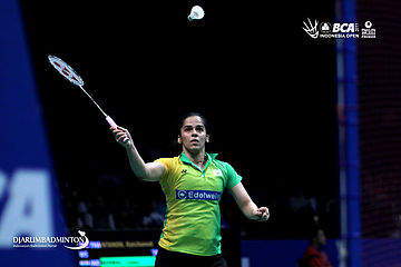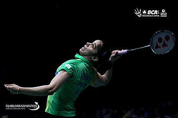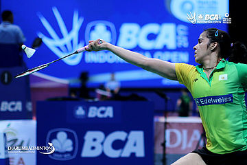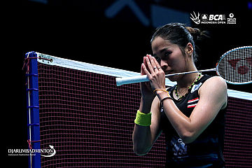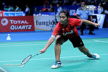 Gregoria Mariska (Indonesia) mengembalikan shuttlecock