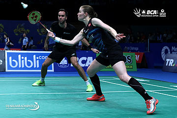 Joachim Fischer Nielsen/Christinna Pedersen (Denmark) mengembalikan shuttlecock
