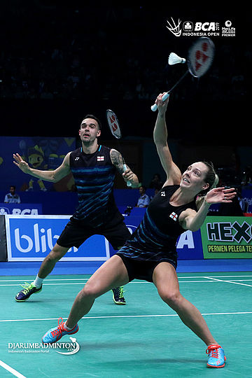 Chris Adcock/Gabrielle Adcock (Inggris) menghadang serangan