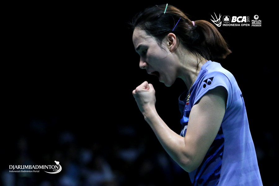 Nitchaon Jindapol (Thailand) bersiap menyambar pengembalian tanggung
