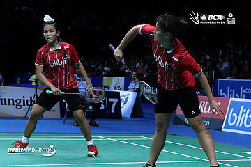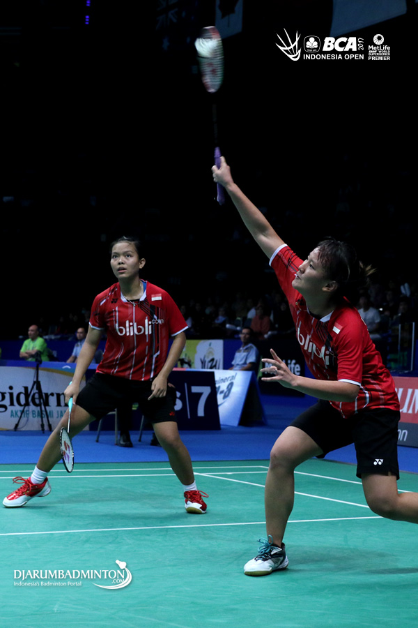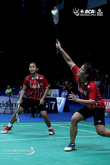 Agatha Imanuela/Siti Fadia (Indonesia) bersiap menghadang serangan