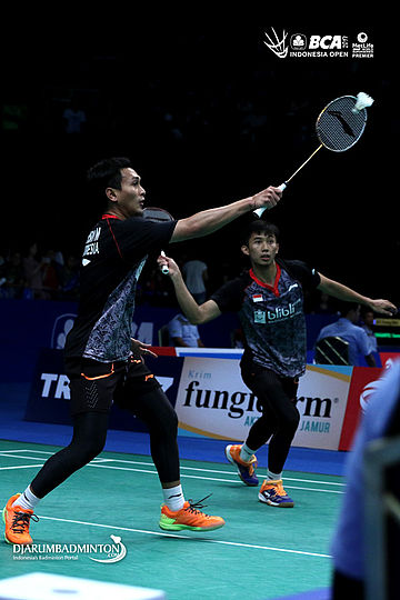 Mohammad Ahsan/Rian Agung (Indonesia) mengembalikan shuttlecock
