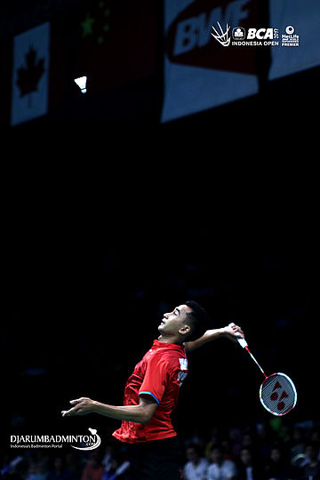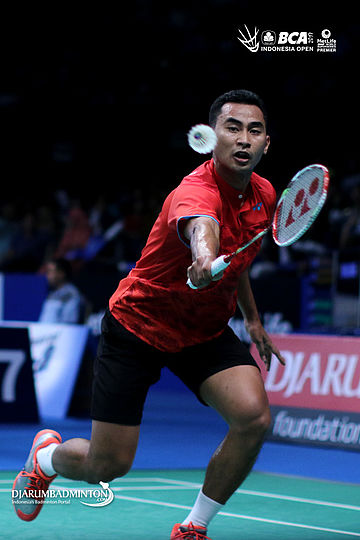 Tommy Sugiarto (Indonesia) bersiap melepaskan smash