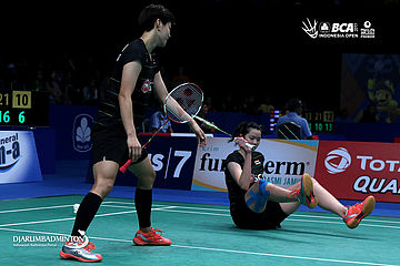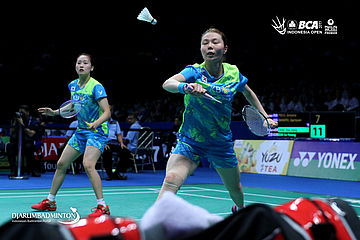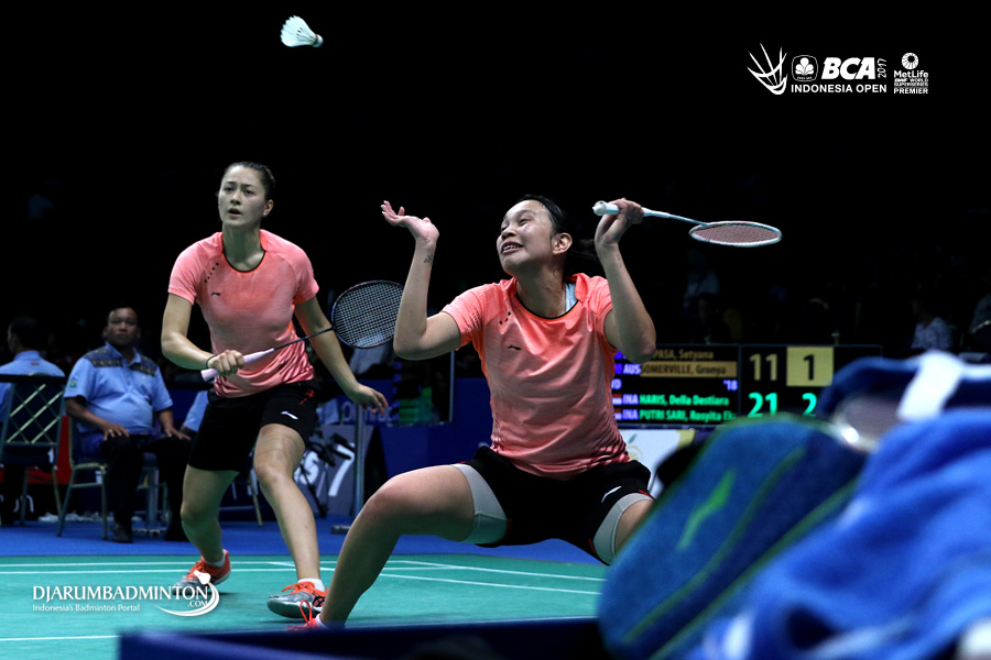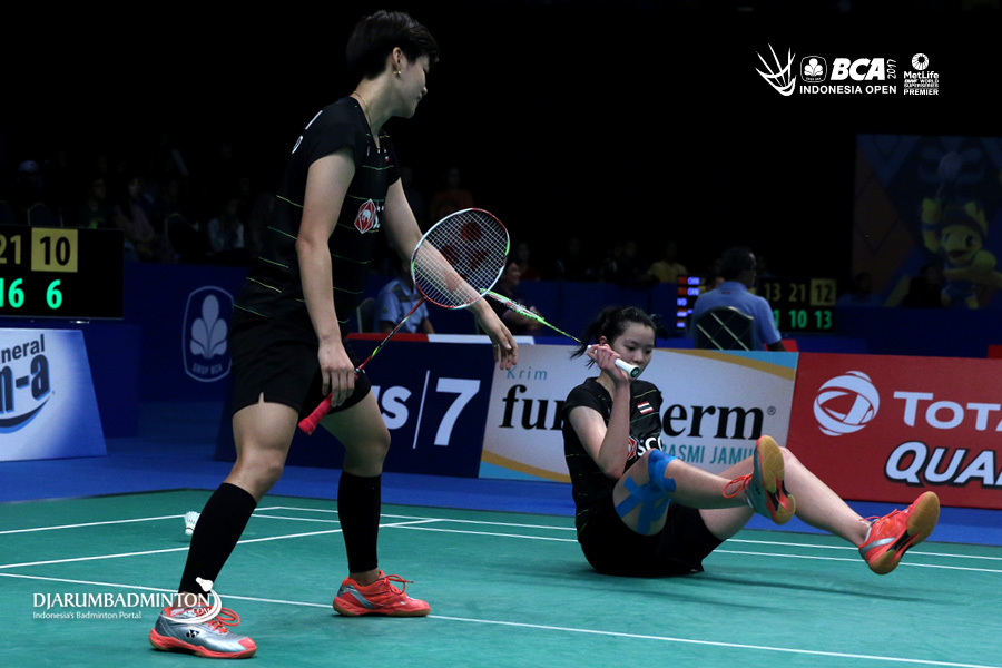 Puttita Supajirakul/Sapsiree Taerattanachai (Thailand) terjatuh saat berusaha menghadang serangan