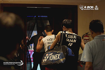 Sony Dwi Kuncoro (Indonesia) dan Kazumasa Sakai (Jepang) bersiap memasuki lapangan