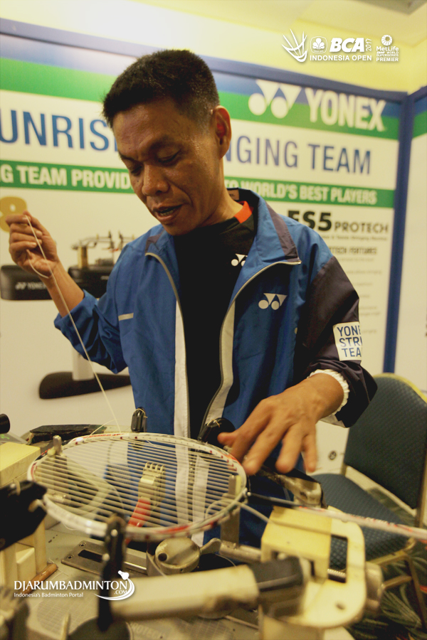 Seorang pekerja sedang memasang senar raket salah satu atlet