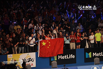Zheng Siwei dan Chen Qingchen (Tiongkok) saat memasuki lapangan pertandingan