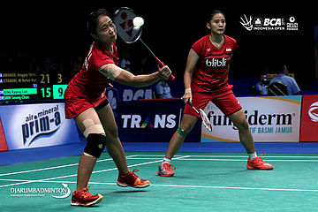 Anggia Shitta Awanda/Ni Ketut (Indonesia) menghadang serangan
