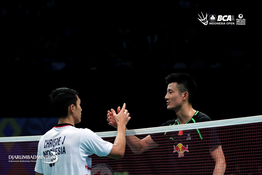 Jonatan Christie (Indonesia) dan Chen Long (Tiongkok) bersalaman usai bertanding