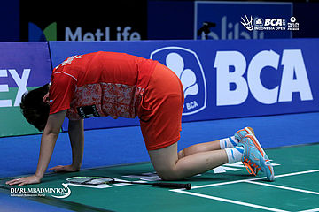 Liliyana Natsir (Indonesia) terjatuh saat berusaha menghadang serangan