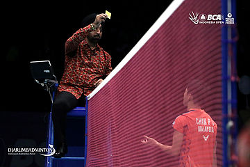 Chan Peng Soon (Malaysia) mendapatkan kartu kuning dari umpire