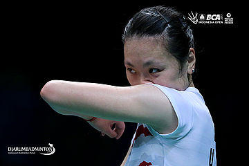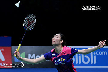 Sung Ji Hyun (Korea) mengembalikan shuttlecock