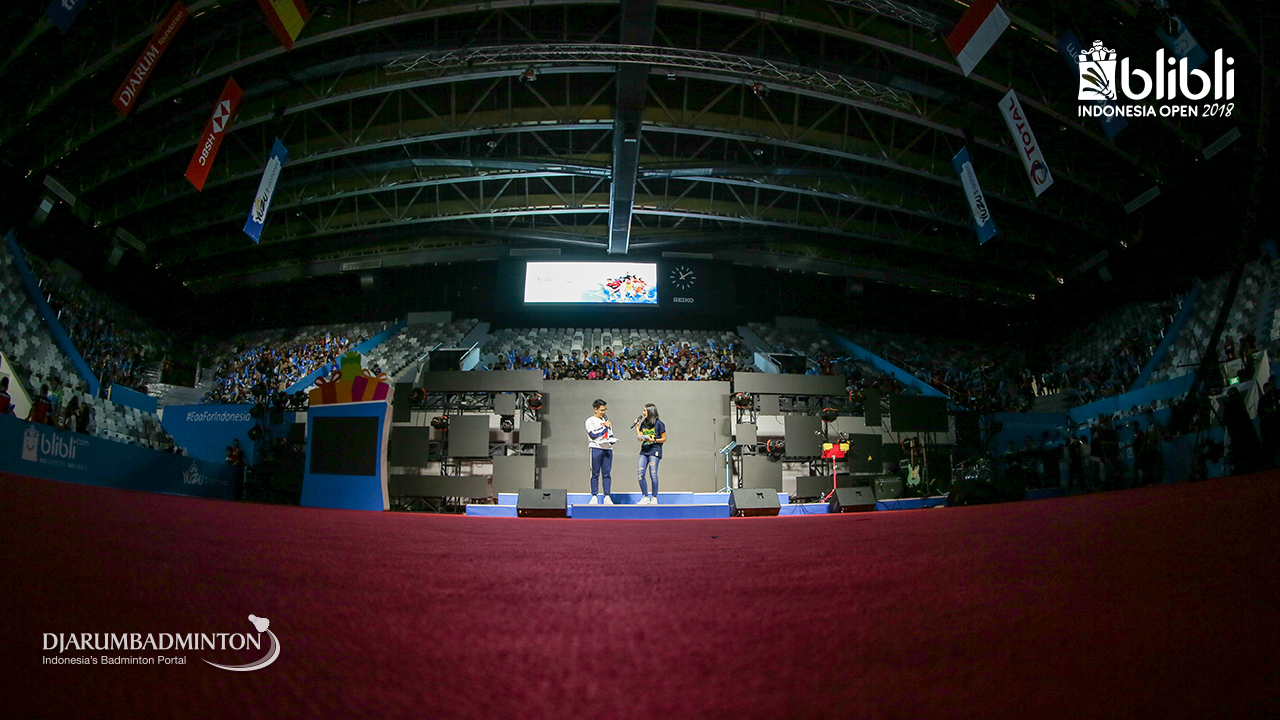 Pembukaan acara oleh MC pada laga semi final BLIBLI Indonesia Open 2018