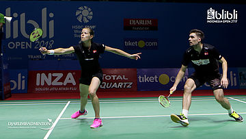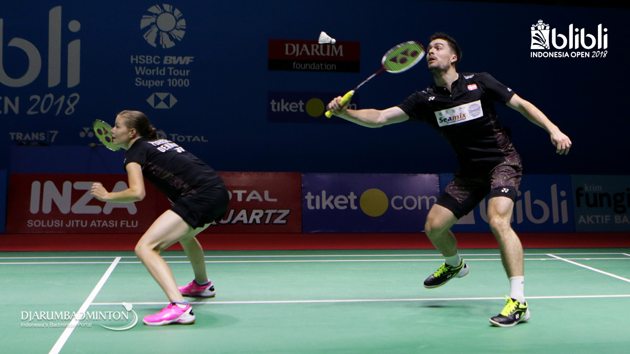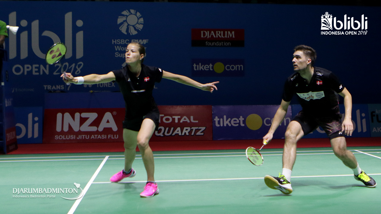 Mathias Christiansen/Christinna Pedersen (DEN) mengembalikan shuttlecock.