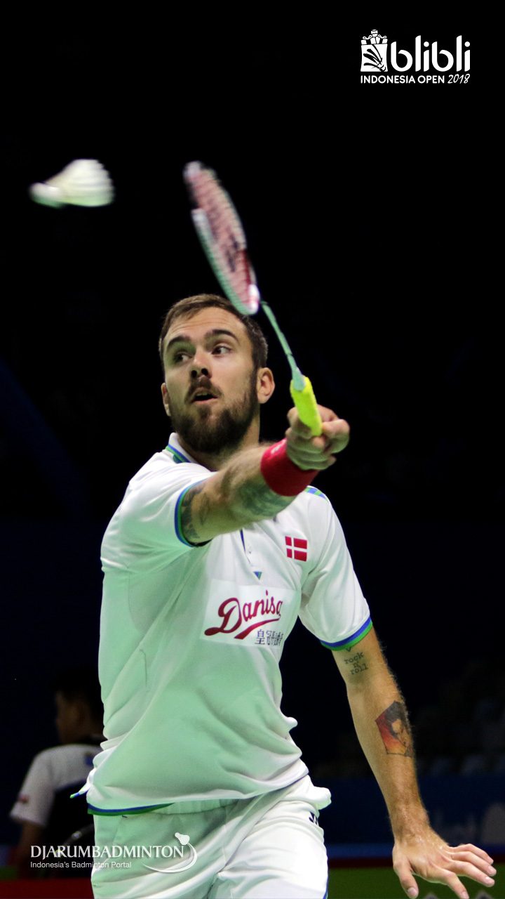 Jan O Jorgensen (DEN) mengembalikan shuttlecock.