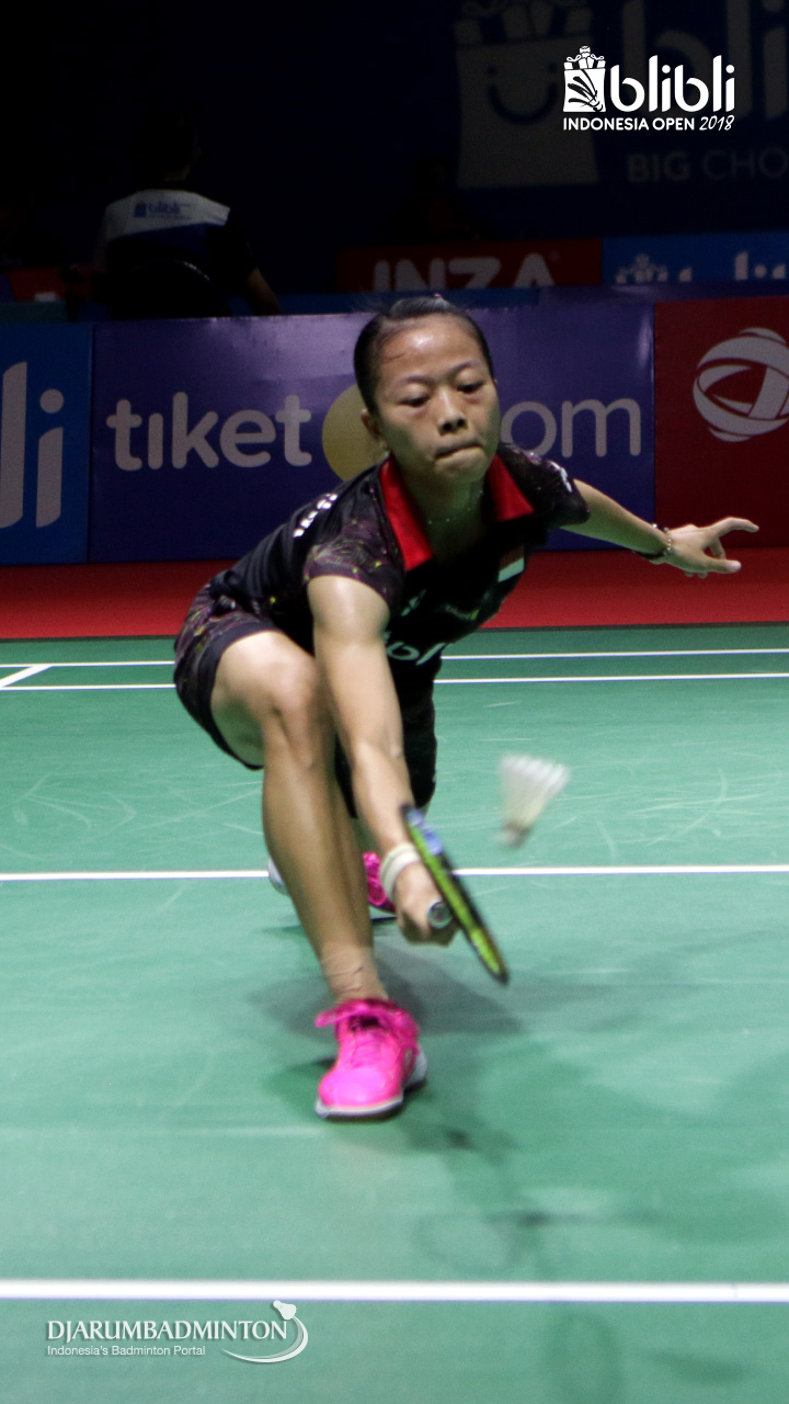 Fitriani Fitriani (INA) mengembalikan shuttlecock.