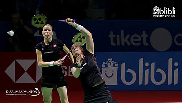 Kamilla Rytter Juhl/Christinna Pedersen (DEN) mengembalikan shuttlecock