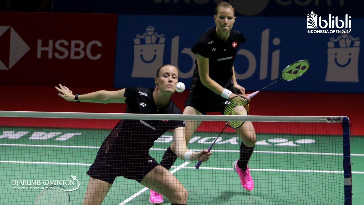 Kamilla Rytter Juhl/Christinna Pedersen (DEN) melepaskan serangan