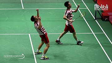 Selebrasi Marcus Fernaldi Gideon/Kevin Sanjaya Sukamuljo (INA).