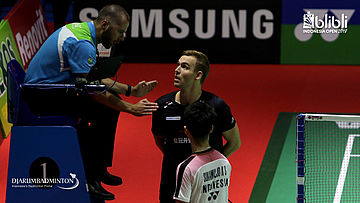 Umpire saat memberikan peringatan kepada Kevin Sanjaya Sukamuljo (INA) dan Mads Conrad-Petersen (DEN).
