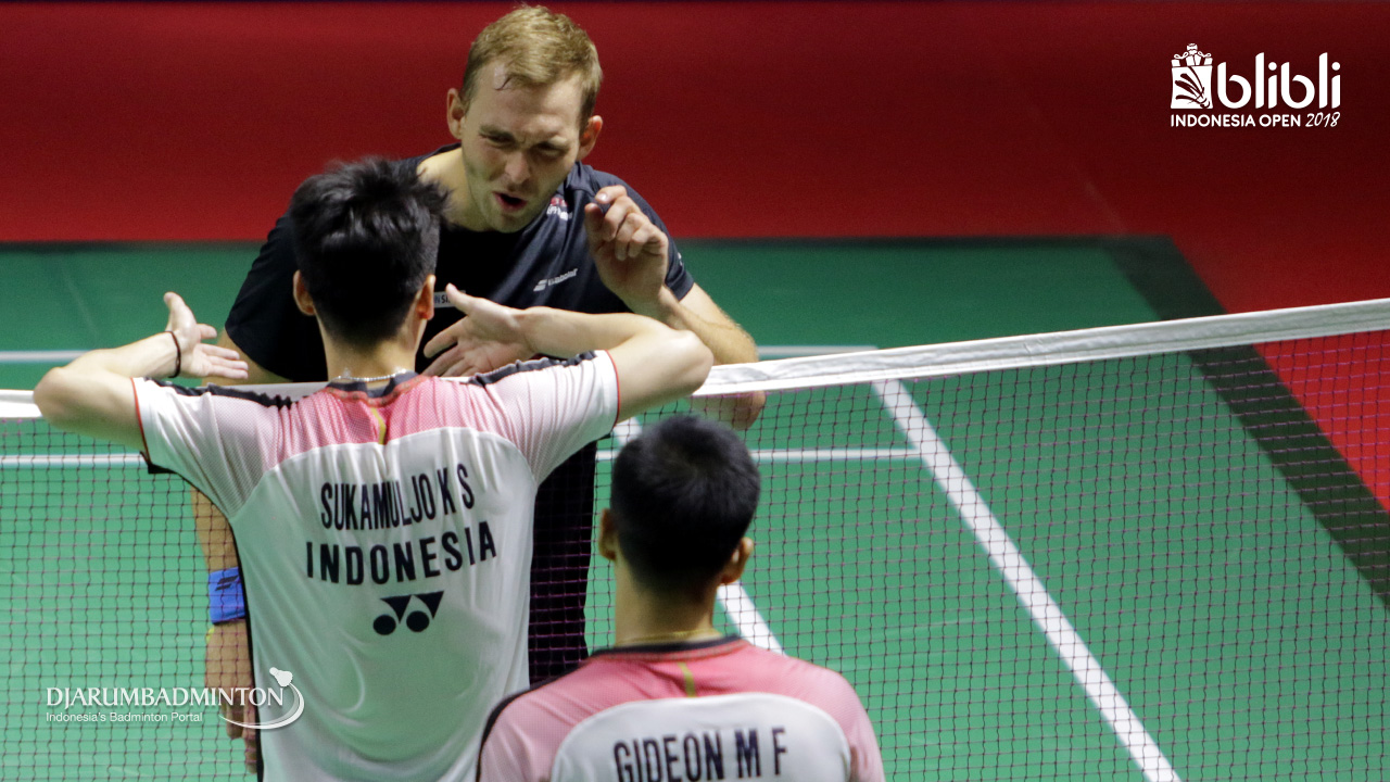 Kevin Sanjaya Sukamuljo (INA) dan Mads Conrad-Petersen (DEN) saling berdebat.