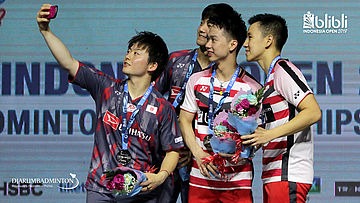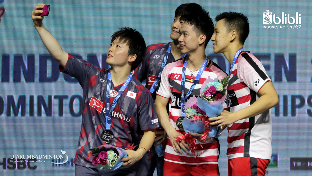 Takuto Inoue/Yuki Kaneko (JPN) dan Marcus Fernaldi Gideon/Kevin Sanjaya Sukamuljo (INA) melakukan selfie bersama di atas podium