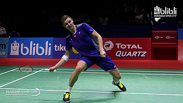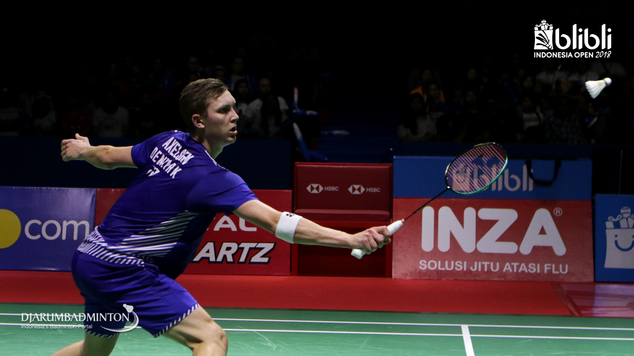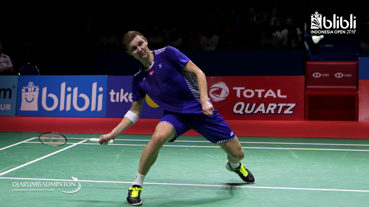 Viktor Axelsen (DEN) mengembalikan shuttlecock