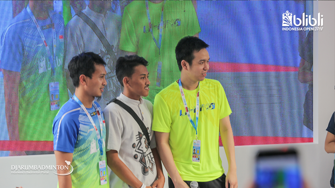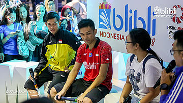 Fajar ALFIAN dan Muhammad Rian ARDIANTO (Indonesia) mendengarkan pertanyaan dari MC di booth BLIBLI