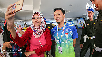 Kento MOMOTA (Jepang) berfoto bersama pengunjung